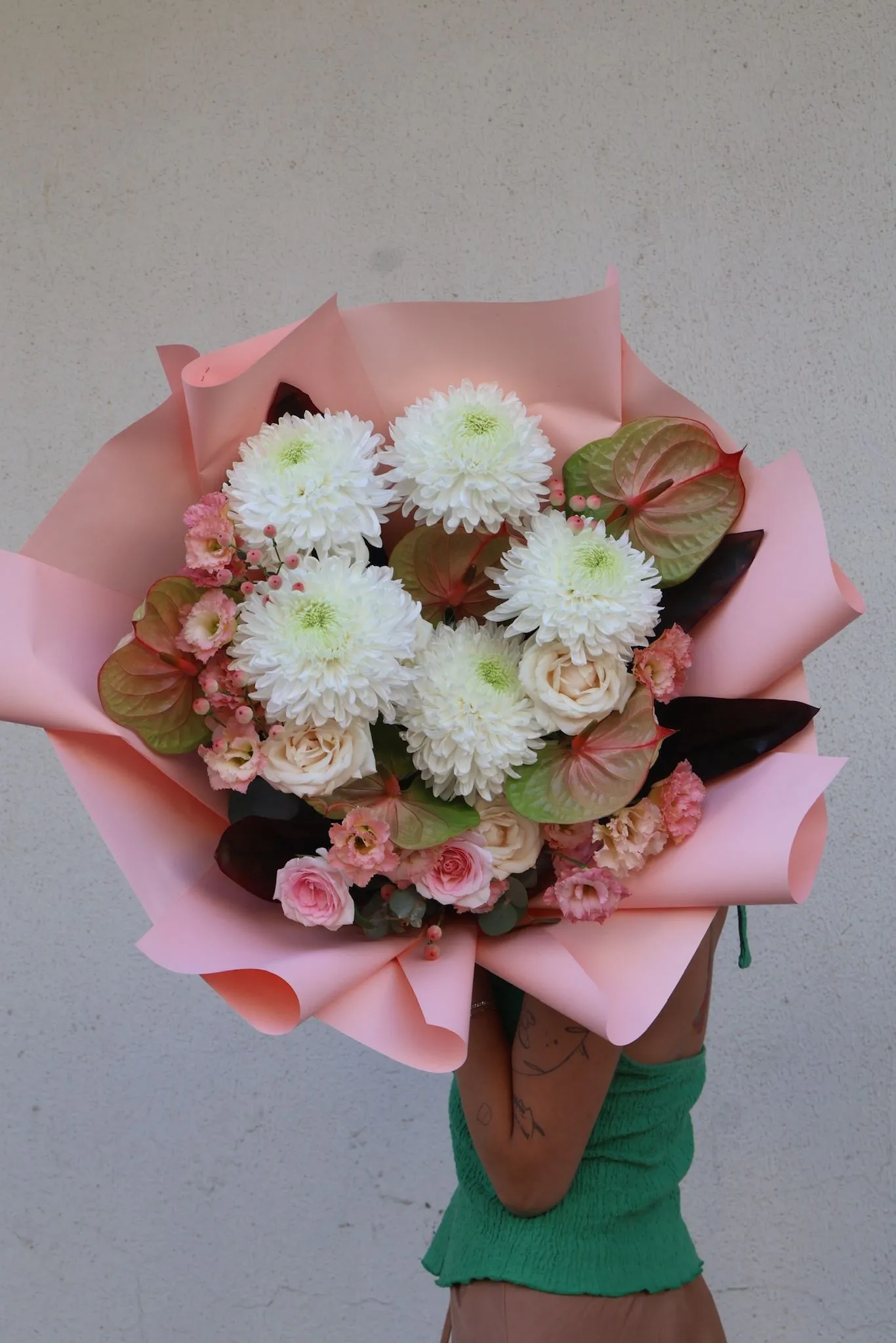 Anthorium, anastasia, hybericium, mevsim çiçekleri ve garnitürlerden oluşan bir aranjmandır.